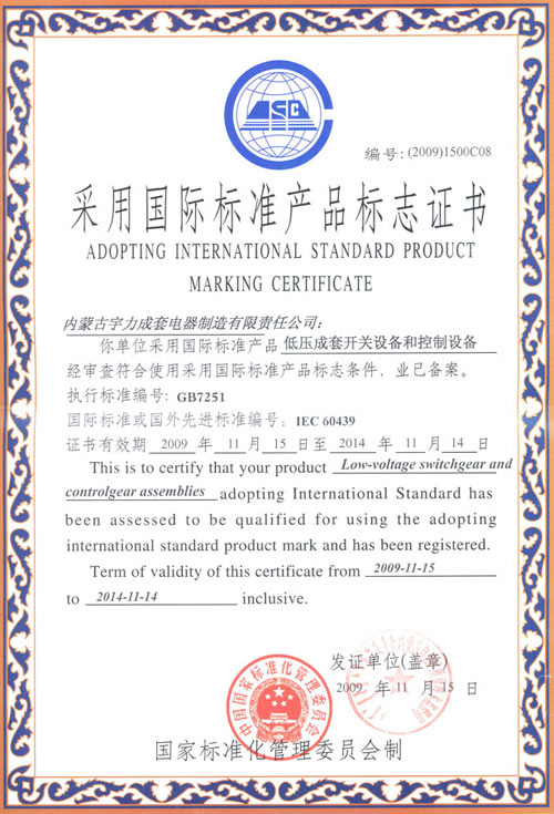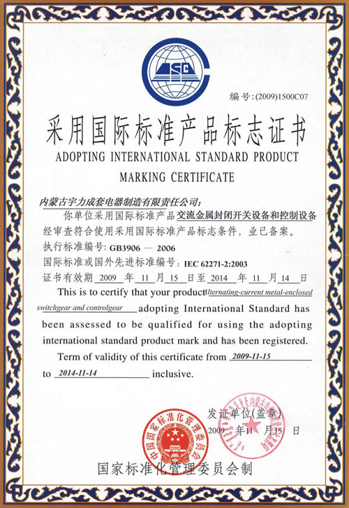 采用國際標準產品標志證書